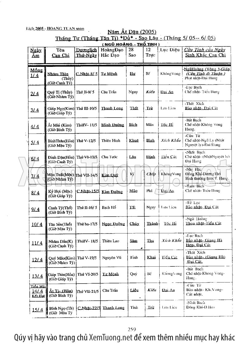 • Xem Ngày Tốt Xấu Vạn Sự: Cung cấp thông tin chính xác về ngày Hoàng đạo, Hắc đạo, giờ tốt xấu (theo các phương pháp cổ truyền như Tam Tông Miếu, Khổng Minh Lục Diệu...) để bạn lựa chọn được thời điểm lý tưởng cho mọi công việc quan trọng.