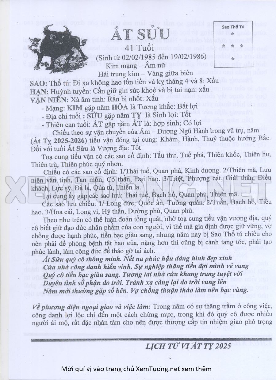 Tử Vi Năm Ất Tỵ 2025 mạng nữ ẤT SỬU