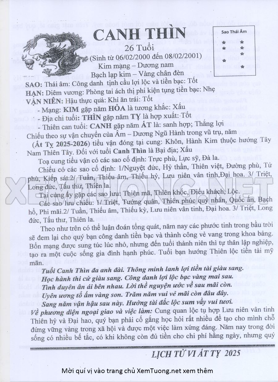 Tử Vi Năm Ất Tỵ 2025 mạng nam CANH THÌN