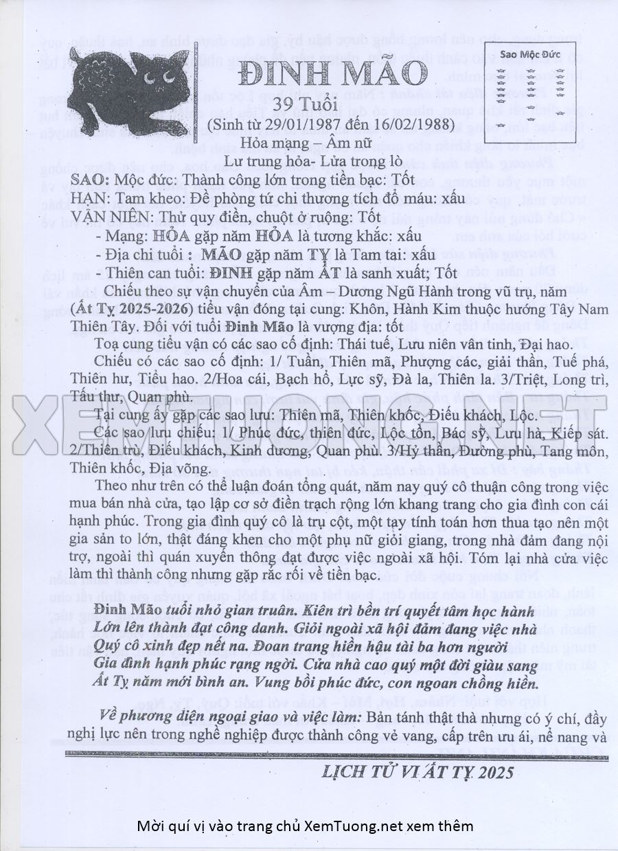 Tử Vi Năm Ất Tỵ 2025 mạng nữ Đinh MÃO