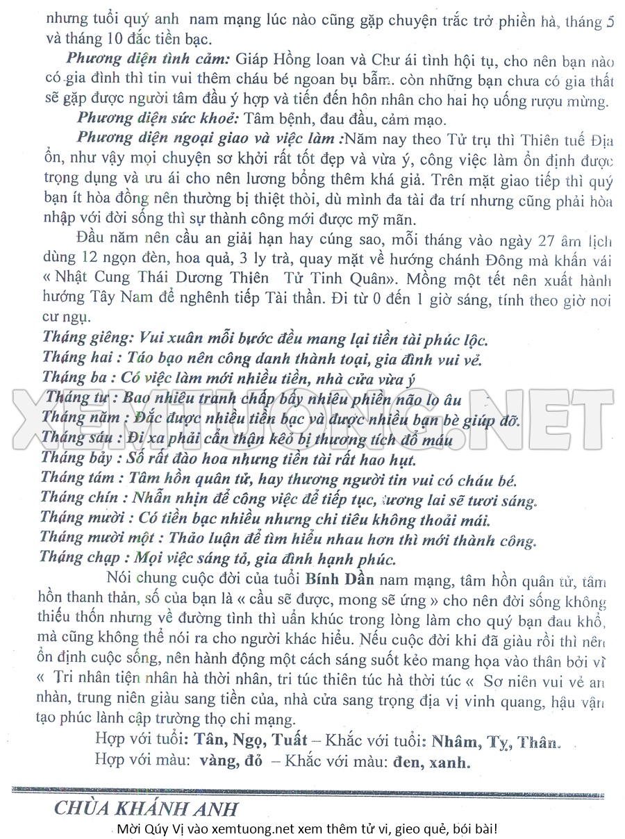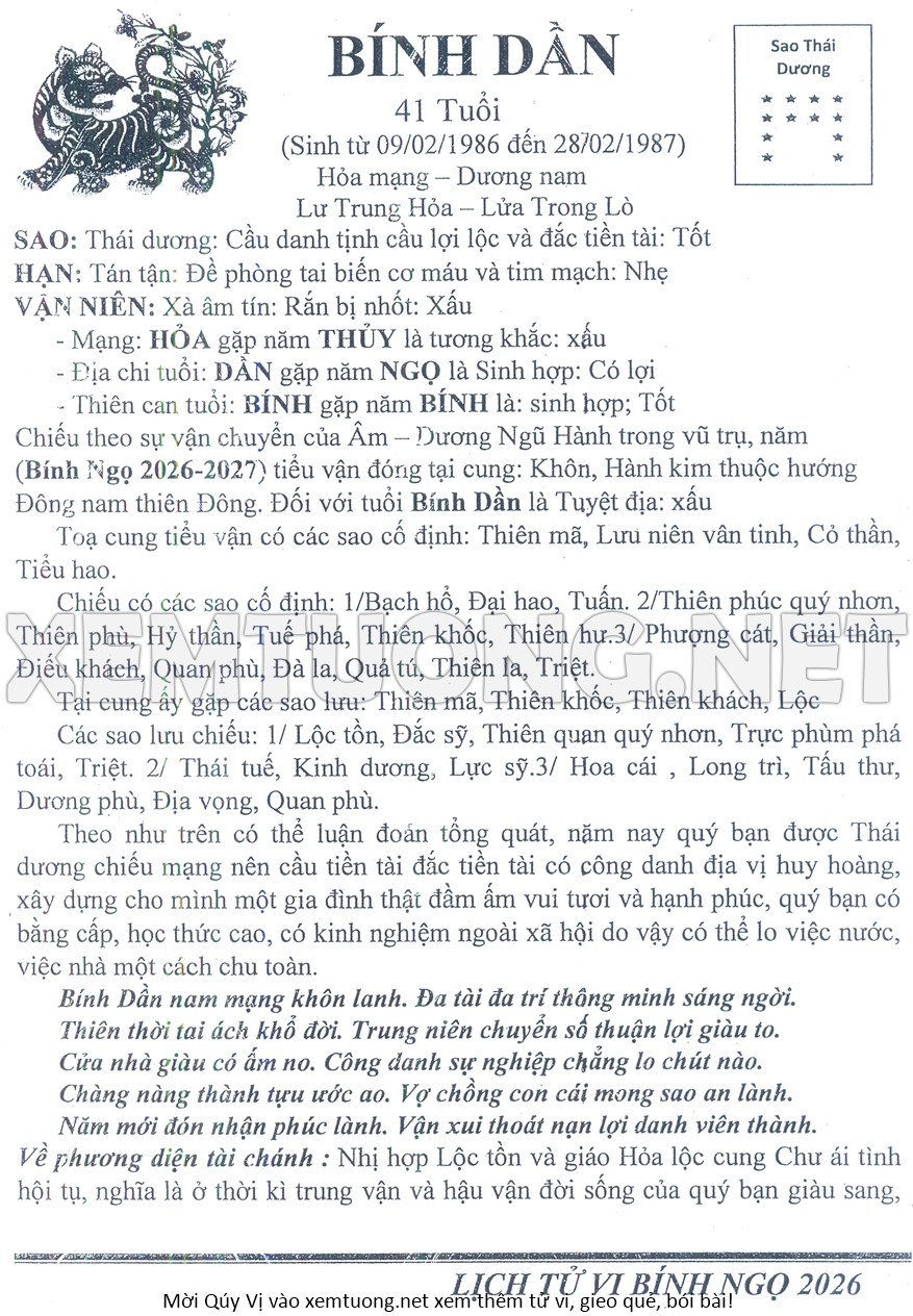 Tử Vi Năm Bính Ngọ 2026 mạng nam BÍNH DẦN