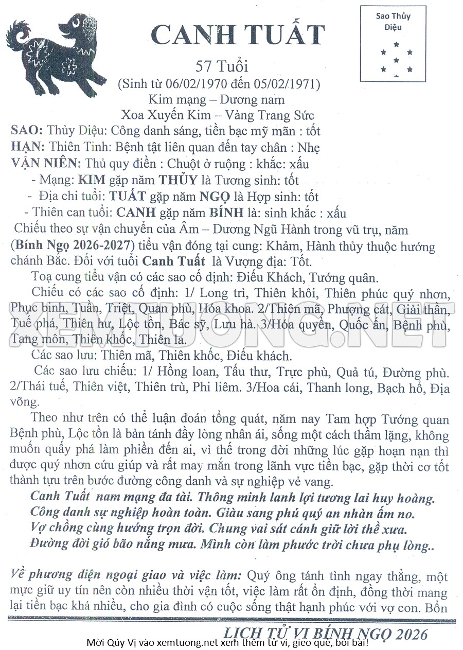 Tử Vi Năm Bính Ngọ 2026 mạng nam CANH TUẤT