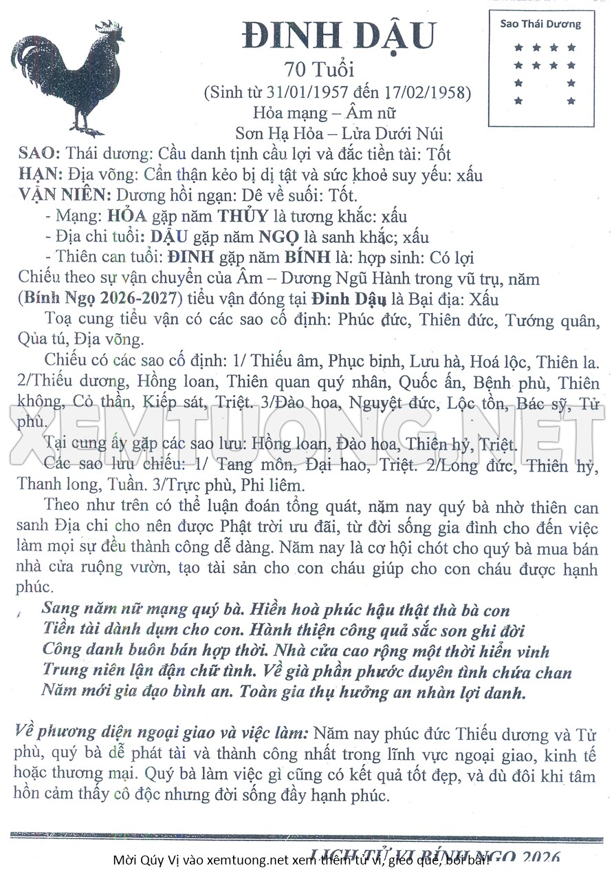 Tử Vi Năm Bính Ngọ 2026 mạng nữ Đinh DẬU