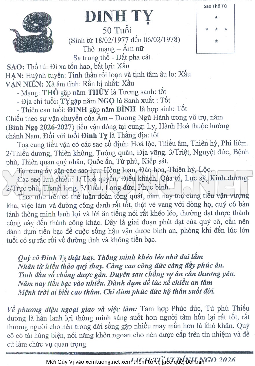 Tử Vi Năm Bính Ngọ 2026 mạng nữ Đinh TỴ