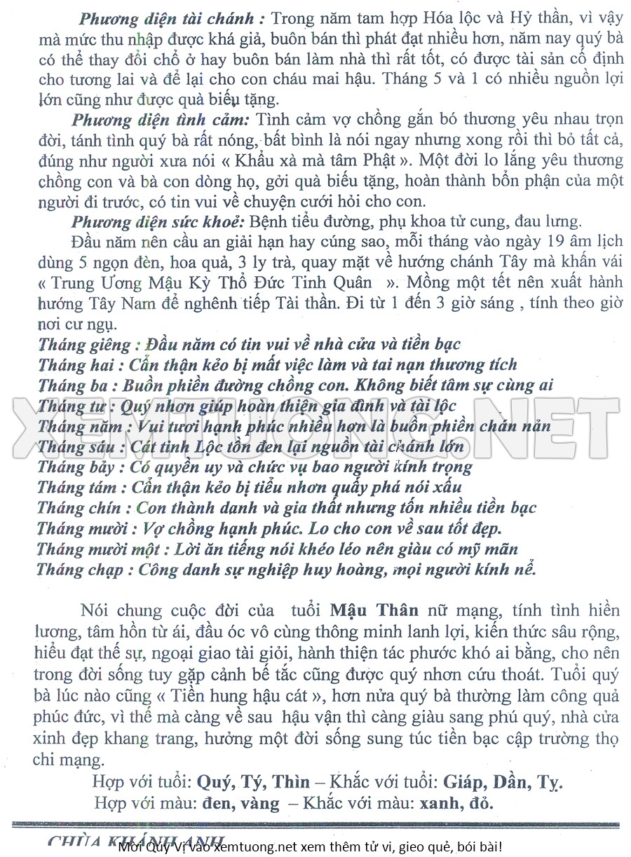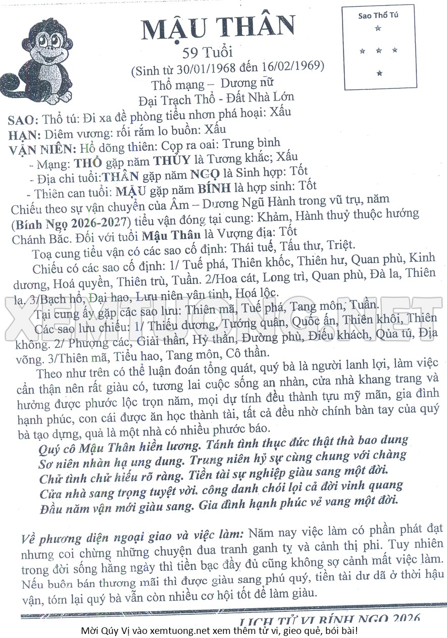 Tử Vi Năm Bính Ngọ 2026 mạng nữ MẬU THÂN