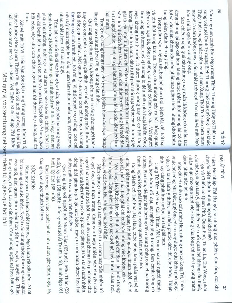 (Lưu ý: Thái Ất Tử Vi được chúng tôi scan từ sách, do đó mỗi tuổi sẽ có nhiều trang, quý vị xem xong hãy nhấn vào trang tiếp theo để xem hết phần tuổi muốn xem. Nếu quý vị xem bằng điện thoại thì hãy kéo qua lại để xem phần bị khuất.)