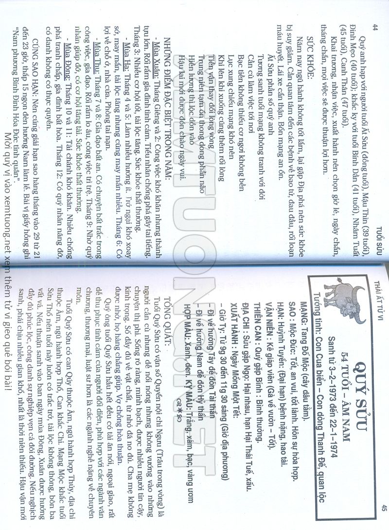 (Lưu ý: Thái Ất Tử Vi được chúng tôi scan từ sách, do đó mỗi tuổi sẽ có nhiều trang, quý vị xem xong hãy nhấn vào trang tiếp theo để xem hết phần tuổi muốn xem. Nếu quý vị xem bằng điện thoại thì hãy kéo qua lại để xem phần bị khuất.)