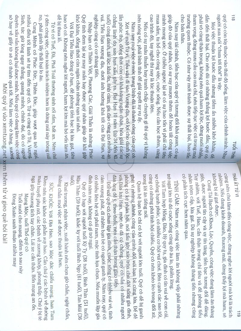 (Lưu ý: Thái Ất Tử Vi được chúng tôi scan từ sách, do đó mỗi tuổi sẽ có nhiều trang, quý vị xem xong hãy nhấn vào trang tiếp theo để xem hết phần tuổi muốn xem. Nếu quý vị xem bằng điện thoại thì hãy kéo qua lại để xem phần bị khuất.)