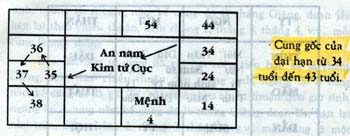 Thí dụ: B - Âm nam, Kim tứ cục, muốn xem lưu đại hạn năm 38 tuổi, phải tính cẩn thận trên bản đồ 12 cung như sau đây: