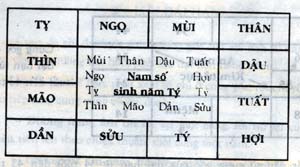 Dân, Ngọ, Tuất Thân, Tý, Thìn Tỵ, Dậu, Sửu Hợi, Mão, Mùi |