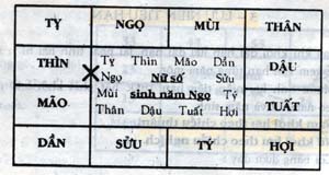 Thí dụ: B – Con gái, sinh năm Ngọ, vậy phải khởi Ngọ từ năm Thìn, ghi chữ Ngọ bên cung Thìn, rồi theo chiều nghịch, ghi chữ Mùi bên cung Mão, chữ Thân bên cung Dần, đoạn lần lượt giang hồ vào bên những cung liên tiếp thứ tự 12 Chi.