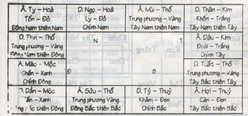 Thí dụ: A – Con trai sinh năm Tý, vậy phải khởi Tý từ cung Tuất, ghi chữ Tý bên cung Tuất, rồi theo chiều thuận, ghi chữ Sửu bên cung Hợi, chữ Dần bên cung Tý, đoạn lần lượt ghi vào bên những cung liên tiếp thứ tự 12 Chi.